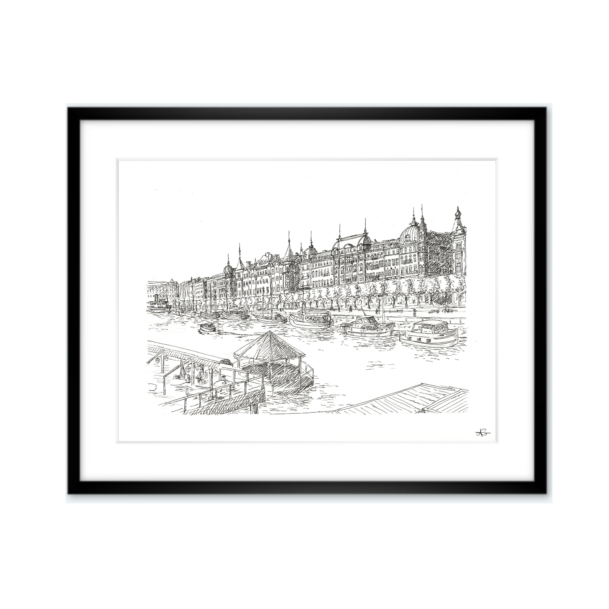 Illustration du port de Stockholm réalisé au feutre Pigma Micron. Disponible en tirage signée et en édition limitée.